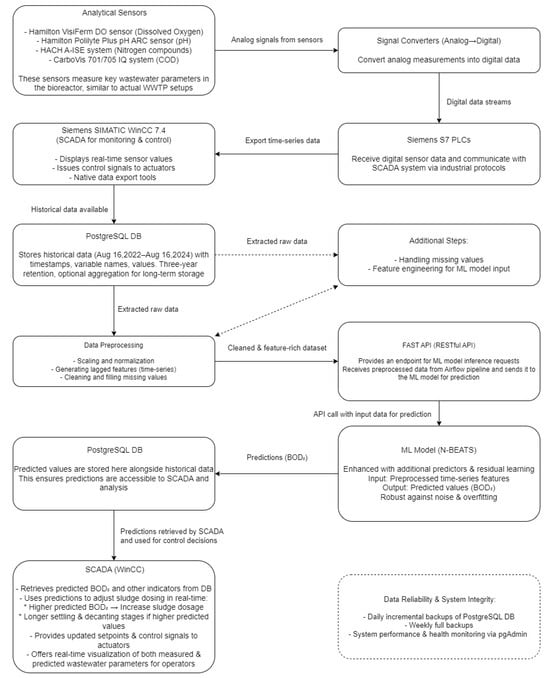 The SCADA system in this study is built on Siemens SIMATIC WinCC 7.4, developed by Siemens AG in Munich, Germany, and integrated with Siemens S7 series programmable logic controllers (PLCs) for seamless communication and reliable control. Analytical sensors measure key wastewater parameters such as dissolved oxygen, pH, nitrogen compounds, and COD, with signal converters transforming analog outputs into digital data streams for real-time monitoring and control. Historical data, collected between 16 August 2022 and 16 August 2024, was stored locally using PostgreSQL, structured into time series tables with timestamps, variable names, and values. This setup supports a retention policy of up to three years for detailed data, with optional aggregation for long-term storage. Data from WinCC were exported to PostgreSQL using native tools, forming the basis for subsequent machine learning (ML) tasks. Apache Airflow automated data extraction at scheduled intervals, performing preprocessing steps such as scaling, generating lagged features, and addressing missing values. The processed data were then sent to the ML model via a RESTful API built with FAST API, with predictions (BOD5 values) returned and stored in PostgreSQL for integration into SCADA workflows and further analysis. To ensure data reliability and system integrity, the database was backed up daily with incremental copies and fully on a weekly basis, while pgAdmin was employed for performance monitoring. The N-BEATS model, enhanced with additional predictors and residual learning, delivered robust predictive accuracy, addressing issues of noise and overfitting, and was seamlessly integrated into the SCADA system to support both real-time and retrospective analysis.