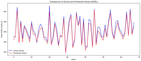 The operation of the SCADA-based automated system stabilized the organic load on the activated sludge, thus contributing to the stabilization of the sludge granulation process. Figure 11 presents the predicted and actual BOD5 values, illustrating the model’s performance.