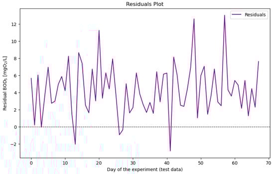 Residual analysis, shown in Figure 7, highlighted that while the model achieved high accuracy, a minor bias was observed, with the model tending to underestimate BOD5 values slightly. This bias is potentially attributable to the limited number of features available for training the model, particularly given the low autocorrelation observed in the time series data (with a maximum significant time lag of 20). Future improvements in predictive accuracy may be achievable by incorporating additional features into the model, which would require further analytical instrumentation.