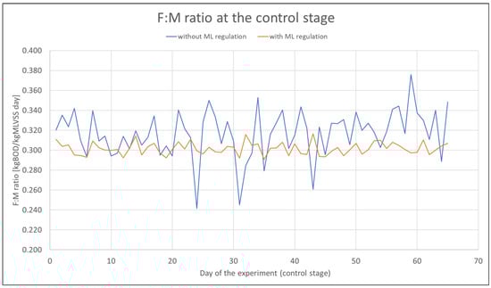 Nevertheless, intelligent predictive control of the sludge dose allowed for the leveling of organic loads on the activated sludge. This is shown in Figure 13, which presents the actual F:M ratio values, as well as the F:M values at a constant MLVSS (5 g/L).