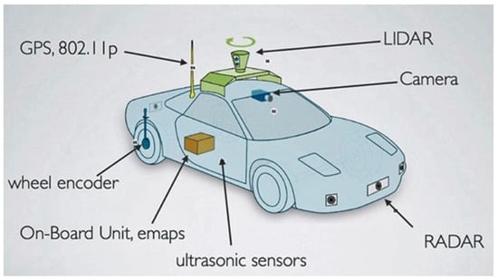 Primary sensors’ integration in autonomous vehicle systems [28]. In the figure, LIDAR represents Light Detection and Ranging, GPS represents Global Positioning System, and RADAR represents Radio Detection and Ranging.