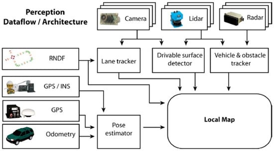 Figure 3 illustrates a multi-layered method through which an autonomous vehicle understands its environment. It begins with the collection of data via a variety of sensors, as presented in Figure 1. These sensors collect visual, spatial, and motion-related information, while the Road Network Definition File (RNDF) offers predefined routes for navigation. The collected data are then processed by specialized units: cameras identify road lanes, LiDAR delineates drivable areas, and radar monitors the velocity and position of nearby objects. Combined with accurate location data from GPS/INS and odometry, this information is processed by the pose estimator, which integrates the data to determine the vehicle’s exact location and direction. Based on this integration, a local map is continuously updated, which the vehicle utilizes for navigation.