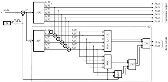 It is feasible to arrange the ECCs with calculation control using multiple diagnostic features concurrently, which enhances the device’s testability characteristics. To illustrate, in reference to [17], a methodology for arranging calculation control at the outputs of digital devices utilizing Boolean signal correction (BSC), or Boolean complement [18,19], is proposed. This methodology allows for the arrangement of constant-weight codes “2-out-of-4”, with additional control over the self-duality of calculated functions. In this instance, the calculation control is conducted on the groups of diagnostic object output by 4. In [20], a modification of this method is presented for use in conjunction with constant-weight codes “2-r-out-of-2r”, where r is the codeword weight of special signal compression schemes. This enables the control of devices with an arbitrary number of outputs via a single ECC. In reference [21], it was suggested to utilize classical Hamming codes [22] for the purpose of calculation control by groups from the outputs , where m and k represent the number of data and checking bits, respectively, that comprise the codeword.