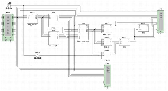 Block HB2 serves as the control block for the correction function calculation and is synthesized in accordance with the specifications outlined in Table 6. The input combinations for the operation of both blocks HB1 and HB2 are conveyed to a cascade of four two-input XOR gates (HB23 device) prior to entering their inputs. The device, in conjunction with the rectangular pulse generator U86 with a duty cycle of D = 50%, enables the device to operate in pulse mode.