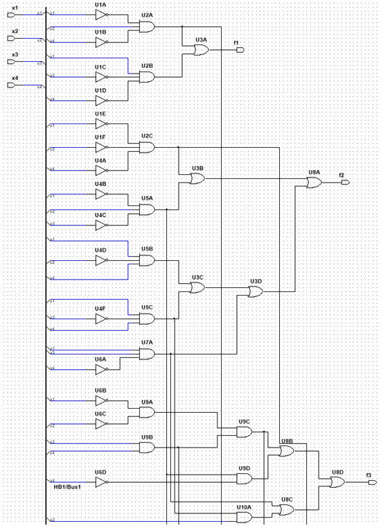 Block HB1 represents the initial diagnostic object synthesized in accordance with the specifications set forth in Table 1. In the process of synthesis, several common gates were identified that facilitate the creation of paths to multiple outputs within the structure of the diagnostic object. This, in turn, creates conditions conducive to the occurrence of multiple errors due to faults in such gates. Figure 4 illustrates a fragment of the diagnostic object, as the whole layout is unnecessarily complex. Nevertheless, the fragment is adequate for comprehending the propagation of faults in circuit structures. In the layout fragment, outputs f2 and f3 share a common U5A gate. In the event of a failure in this gate, a double fault may occur at outputs f2 and f3.
