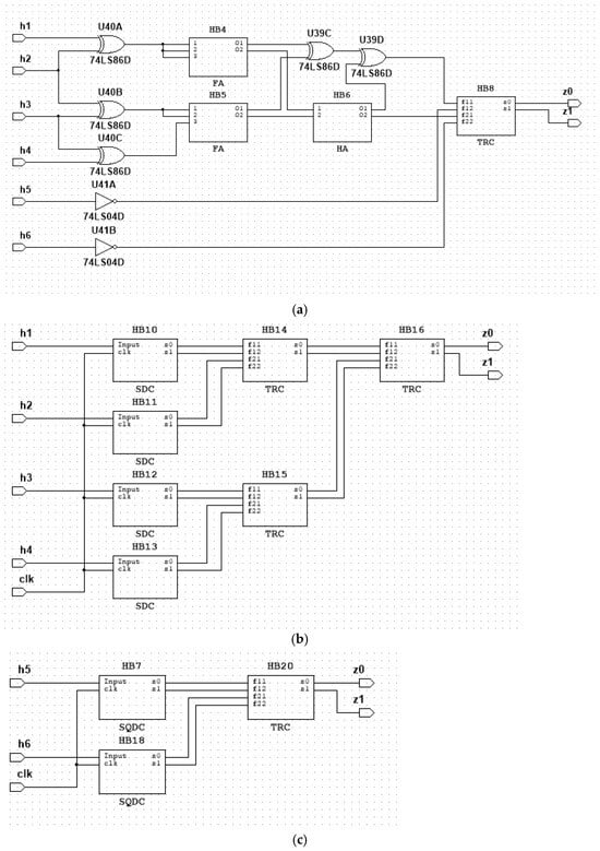 To ascertain whether the formed bits h1, h2, h3, h4, h5, h6 are indeed part of the WT(4, 2, 4)-code, a checker of this code, namely the HB9 device, is installed (see Figure 6a). Functions h1, h2, h3, h4 constitute data bits of the WT(4, 2, 4)-code and are initially classified as SD-functions (see Table 6). The 4SDC1 (HB21) device (see Figure 6b) is installed for the purpose of controlling self-duality. Functions h5, h6 constitute the checking bits of the WT(4, 2, 4)-code and originally belong to the class of SQD-functions (see Table 6). The 2SQDC1 (HB13) device (Figure 6c) is installed for the purpose of monitoring the self-quasiduality.