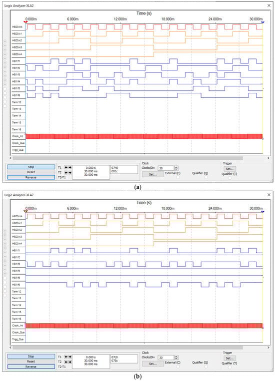 The checker outputs are combined at the inputs of the HB22 two-rail compression block. The logic analyzers XLA1 and XLA2 are connected to the various control points in the model, which are used to construct timing diagrams of operation. Initially, the correct operation of the synthesized self-checking device in the absence of faults was simulated. The operation layouts shown in Figure 7a and Figure 8a demonstrate the correctness of the calculations, as evidenced by the presence of a two-rail pulse signal at the outputs of the checkers. The common-mode signal is generated exclusively at the outset of circuit operation, due to the fact that at circuit inception, the identical logic zero signal is present on both checker lines. Following a clock cycle, the pulse nature of the circuit operation is revealed, and the checker reverts to its normal state.