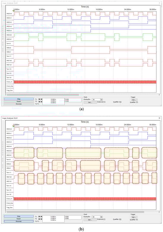 Timing diagram derived from the model control devices (XLA1 analyzer): (a) free from faults; (b) exhibiting faults.