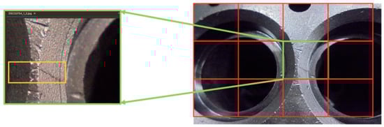 - Laboratory setup: A Basler ace 3088-16 gm, monochrome area scan camera with an Edmund Optics 8 mm HP series lens was used along with custom C++ code to automate the image acquisition. The camera was positioned at a 100 mm working distance from the cylinder head, with a fixed f/4 aperture, 8 bit pixel depth, and perpendicular alignment for all images, using a Techman TM5-900 cobot. The camera system captured images at a resolution of 3088 × 2064 pixels, corresponding to approximately 28 pixels/mm. Illumination relied on ambient lighting conditions (fluorescent lighting), and the camera employed no filters to mitigate spectral interference from the ambient lighting. Images were captured at the center of each pre-defined grid box measuring 110.28 mm × 74.33 mm on the cylinder head surfaces. No camera models to correct for distortions created by the camera perspective and lens elements were applied to these images. The cast iron cylinder heads were sampled and provided by a remanufacturer in the “cleaned” state produced in the remanufacturing process to enable the manual methods used for defect inspection.