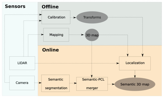 Each of the challenges is addressed by means of different hardware and/or software solutions, resulting in multiple information and data flows that need to be integrated in a synchronous manner. This is carried out by applying the simple modular pipeline illustrated in Figure 1. As detailed in the figure, the data captured by the hardware sensors are processed online, merged with localization details, and analyzed through semantic segmentation. However, this requires a preliminary offline processing step for calibration and initial mapping purposes.