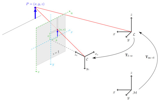 where denotes the intrinsic camera parameters matrix, encoding the transformation from the camera coordinate system to the pixel coordinate system , and , the transformation from the LiDAR coordinate system , to the camera coordinate system . Transformations and 2D and 3D coordinates are, through the rest of the article, expressed in homogeneous form.