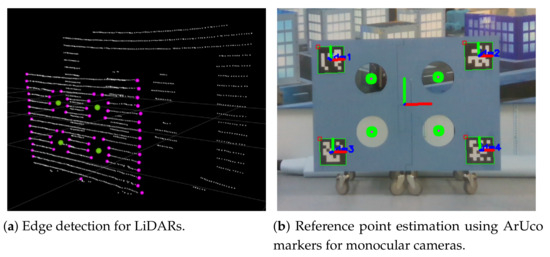 Next, the remaining points are projected on the planar model, resulting in a 2D point cloud. The circular holes are then extracted using a 2D circle segmentation. This is performed iteratively, removing inliers, until the remaining points are insufficient to describe further circles. At least four circles must be found to proceed, otherwise the current frame is discarded. Monocular cameras rely on using the four ArUco markers as an ArUco board [57] to estimate the relative position of the target. Examples of successfully captured camera projections are displayed in Figure 5b. Once circle centers have been found, the processing of sensor data across modalities are the same. To rule out incorrect detections, a geometric consistency check is performed. The circle center points are grouped in sets of four, and the dimensions of the rectangle they form together are compared against what is theoretically expected. The assumption is that there should only be one valid, geometrically consistent set. If more than one, or zero, valid sets are found, the frame is discarded. Otherwise, the center-points are converted back into 3D space, and the resulting cloud of four points is considered to be valid reference points. Having a single set of reference points per sensor is technically sufficient, but to reduce potential errors, such as from sensor noise, multiple sets are accumulated per sensor, i.e., 30, and verified using Euclidean clustering [61]. In the case of detecting more than the expected four clusters, the data are considered unreliable, or else cluster centroids are used as reference points for the second stage. Furthermore, Ref. [56] allows for (and recommends) accumulating reference points over P target poses as to generate reference points, adding further constraints in order to improve the final results.