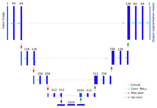- Ronneberger, O.; Fischer, P.; Brox, T. U-Net: Convolutional Networks for Biomedical Image Segmentation. In Proceedings of the 18th International Conference, Munich, Germany, 5–9 October 2015; pp. 234–241. [Google Scholar] [CrossRef]