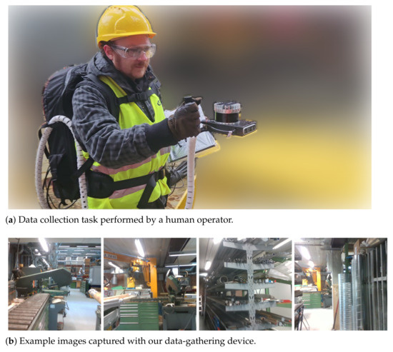 In order to further validate our automated corrosion detection system in operational industrial settings, a test was performed at the Aalborg University Smart Production Lab. This realistic manufacturing environment is composed of a small industrial research factory lab devoted to various areas devoted to robotic automation, production technologies, palletizing, storage, welding, etc. We conducted data recordings traversing a large part of the asset both inside and outside the main factory building, testing and validating the LiDAR and camera data recordings in both indoor and outdoor settings. In relation to this validation test campaign, Figure 11 illustrates both a human operator handling the measurement device and backpack and example pictures of the indoor industrial environment captured by the camera.