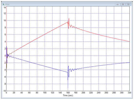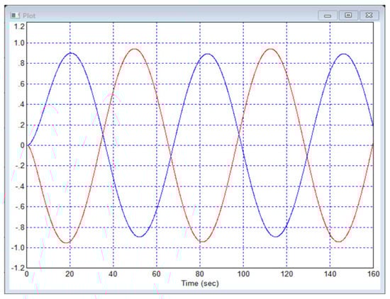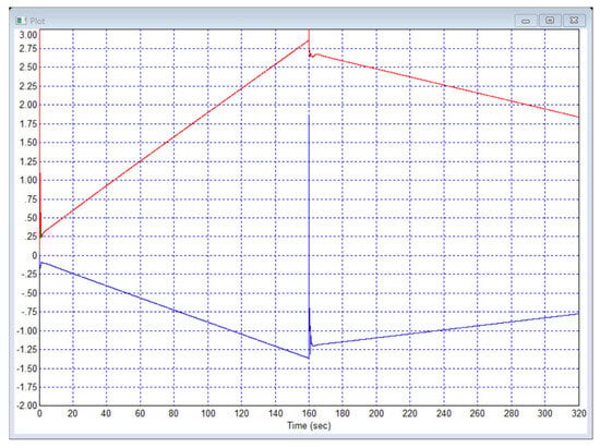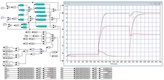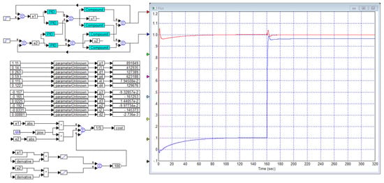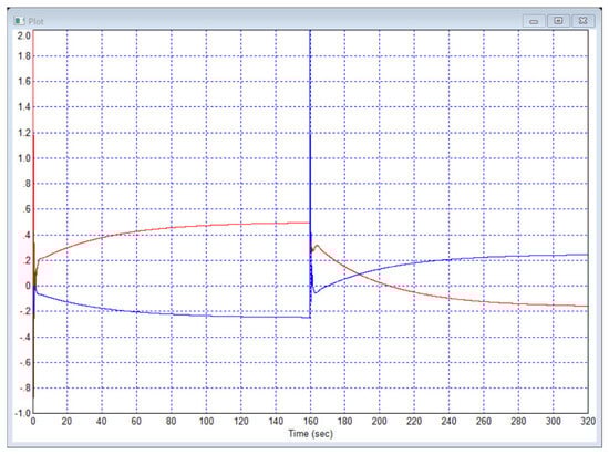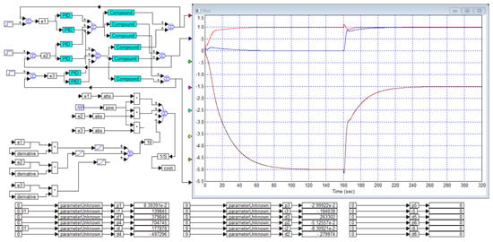 Here, in the upper left element in the numerator, in comparison with Example 4, the polynomial is used instead of the polynomial. This eliminates the static degeneracy of this matrix. The numerical optimization of the system with this object provides successful control. The project for optimization and the results are shown in Figure 5. In this Figure, after obtaining the exact values of the coefficients, they are all rounded to three significant digits, which ensures the result is checked for roughness. The system is rough, that is, no increased sensitivity to a negligible change in the coefficients are revealed, which proves the possibility of the practical application of the obtained result. Figure 6 shows the control signals in the system with these controller coefficients. These signals do not demonstrate a continuous increase in magnitude in those intervals where the output signals take the required values prescribed by the task signals. Therefore, the property of the obtained system is confirmed, consisting of the absence of the need for a constant increase or decrease in the control signals according to a law that is close to linear. This property, together with the sufficiently high quality achieved for the transient process, confirms the possibility of using the calculated regulator for the object of this example in practice.