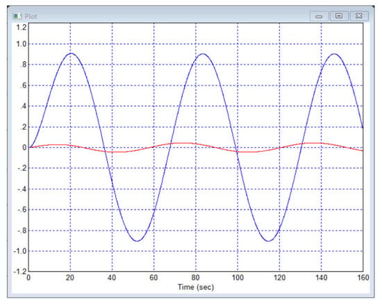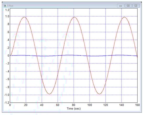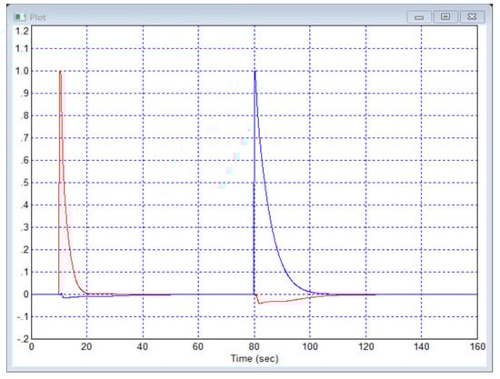 It is clear that we have partially succeeded in achieving separate control of the object, but this result is not yet actual autonomous control in the full sense of this meaning. If the task had been solved successfully, then the red beam would have reached a unit value quite quickly in accordance with the prescribed signal , and the blue beam would have shown a zero value for half the duration of the process, changing to a unit value at the moment . It is also highly desirable that these processes have minimal overshoot and minimal oscillation amplitude, and that these oscillations quickly damp out. The biggest problem in these processes is that the steady-state values do not coincide with the task.