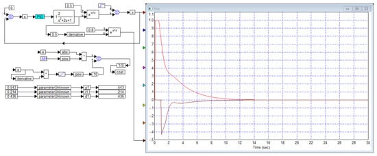 VisSim software (each versions) contains three optimization methods integrated into it to find the minimum of the objective function, and one more optimization method to find the zero of the objective function. We used only the minimum search, in which case the objective function is called the cost function or simply “Cost”. The Powell, Polak–Ribiere and Fletcher–Reeves methods were used. Many years of experience show that the Powell method always works better when solving regulator optimization problems. This is manifested in the fact that sometimes other methods do not demonstrate convergence, that is, the optimization procedure ends with a message that the optimization could not be performed since one of the quantities reached an unacceptably large value, that is, .
