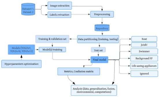 Effective search and rescue (SAR) in the expansive and dynamic marine environment hinges on the swift and precise detection of objects. Marine object detection, a critical field within computer vision and remote sensing, utilizes various imaging technologies, including satellite imagery, synthetic aperture radar, sonar, and underwater cameras, to identify, classify, and locate items in oceanic settings []. Sophisticated algorithms, particularly convolutional neural networks (CNNs), have demonstrated an exceptional ability to automatically learn complex features from image data. The integration of deep learning into unmanned aerial vehicles (UAVs) and other autonomous systems is revolutionizing maritime SAR operations, offering rapid deployment, broad area coverage, and immediate visual data analysis []. This move towards AI-driven SAR represents a major paradigm shift, overcoming the limitations of human-centric approaches and leading to more efficient and effective emergency responses at sea. Beyond SAR, this technology plays a vital role in diverse applications, such as locating shipwrecks and mines, as well as mapping marine habitats, particularly in underwater environments with limited visibility and complex acoustic conditions []. Marine object detection is increasingly important for enhancing autonomous underwater vehicle (AUV) safety and underwater infrastructure inspection efficiency, significantly improving upon limited human observation from ships or aircraft across vast maritime search areas.