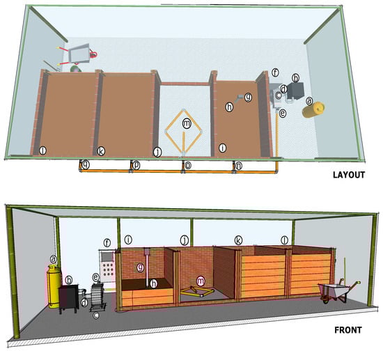 This study was conducted at a research and training center located in La Vega (4°52′18.932″ N, 74°25′6.54″ W), Cundinamarca, Colombia, at the Alto del Vino (2835 m above sea level) on the eastern mountain range to the west of Bogotá. The poultry production farm experiences average daytime temperatures of approximately 19 °C, which decrease to around 7 °C during the night []. The composting plant, housed in a greenhouse with brick and cement flooring, comprises four cubicles (i, j, k, l), each with a 4.3 m3 capacity, as shown in Figure 1. Each cubicle uses 4.0-inch perforated PVC pipes for aeration, supplied by an industrial fan (c) controlled by manual valves (n, o, p, q). The fan assembly includes a damper valve (d) and a gas burner (b) with a heat exchanger equipped with a solenoid valve and an ignition pilot. A variable speed drive adjusts airflow. Three sensors monitor the process: a temperature sensor (e) at the heat exchanger outlet, a combined temperature and oxygen sensor (g) inside the biopile, and a humidity sensor (h), also in the biopile. All sensors are connected to an IoT-based control system (f) for both manual and remote operation. The thermophilic phase was maintained at approximately 40 °C for 7 days, constrained by the high-mountain climate’s low ambient temperatures (7–19 °C) and the heat exchanger’s capacity, preventing the system from reaching the ≥55 °C threshold recommended for pathogen elimination []. This phase is aligned with cold-climate composting studies, where lower temperatures suffice to stabilize organic matter.