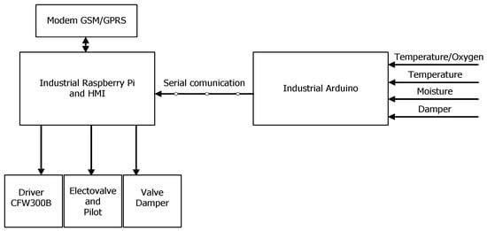 Figure 2 shows the control and communications architecture, which is composed of an industrial Arduino that acquires all analog signals of the system (biopile temperature, air temperature, moisture, and damper position). The acquired signals are sent by serial communication to an industrial Raspberry Pi that includes an integrated human–machine interface where the plant commissioning operations are performed (ignition of the gas heat exchanger, output control, control of the frequency inverter cfw 300b, and control of the damper valve). The Raspberry Pi is connected to a modem to allow internet access via GSM/GPRS.