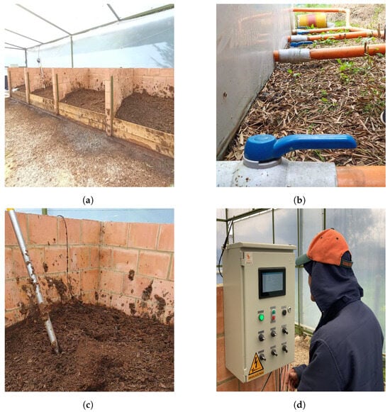Commissioning of the automated composting plant with forced aeration: (a) cubicles loaded with chicken manure, (b) forced aeration techniques, (c) sensor implementation in the biopile, (d) plant verification and commissioning.