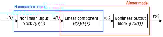 where the terms InputNonlinearity and OutputNonlinearity, specified as idUnitGain in the software implementation, correspond to identity mappings in the mathematical model; that is, the nonlinear functions and are defined as in Equation (30):