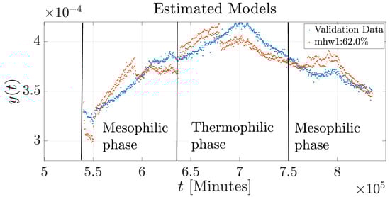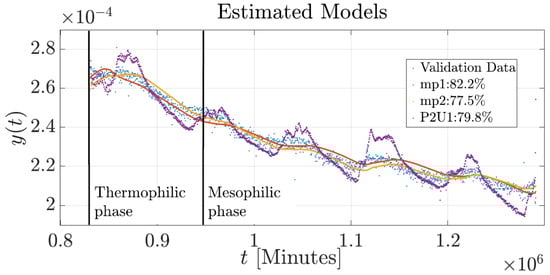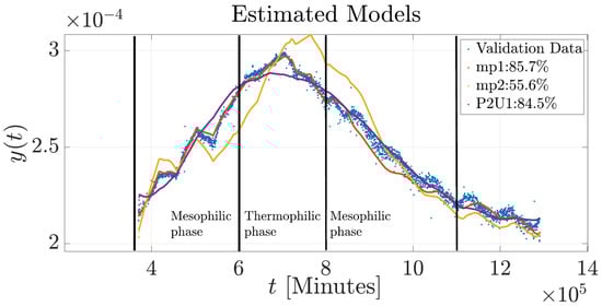 Subsequently, the results of the four model structures were compared using data from Experiment 2, which were different from those used in the identification process. Figure 8 illustrates the behavior of three models compared against the data from Experiment 2. The mp1 and P2U1 models were able to reproduce the basic dynamics of the composting process. In contrast, the mp2 model failed to reflect the fundamental temperature profile, exhibiting a significant mismatch. The mp1 model also showed deviations in the initial conditions as well as during the mesophilic and thermophilic phases. The P2U1 model demonstrated improved performance in capturing the initial conditions and the mesophilic phase compared to the mp1 model; however, it was not able to accurately reproduce the behavior during the thermophilic phase.