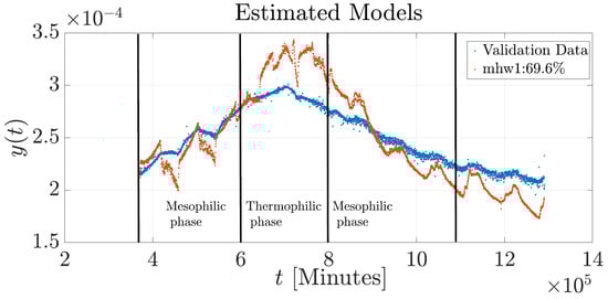 After collecting the data of the measured variables [], the input (humidity, heater temperature, and air flow) and output (biomass temperature) data were preprocessed and the system was classified as MISO []. Within the theory of system identification, it is recommended to start with a mathematical relationship of inputs and outputs and then move on to more complex structures []. Therefore, three structures were initially selected: transfer function (TF), state space (SS), and process (P); then, a nonlinear Hammerstein–Wiener (HW) structure was selected. Another important characteristic to consider in system identification is the model order; accordingly, the study began with a review of classical energy and mass balance equations found in the literature describing the composting process. It was observed that most of these models are first-order; for this reason, the modeling work was started with first- and second-order models. Model estimation was performed using 50% of the measured data from Experiment 1. The dataset used for this purpose started at data point 1235, as the humidity from that point onward remained within the range of 50% to 60%, ensuring that the composting process had properly commenced.