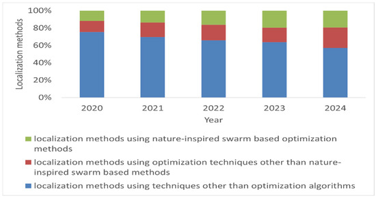We have conducted a detailed analysis of the various types of localization techniques using dimension databases from 2020 to 2024 [4]. Around 2100 papers were selected using the keywords “wireless sensor network” and “localization”. From these, approximately 600 papers were further identified using the additional keyword “optimization”. These papers were then manually reviewed to identify publications that employed swarm-based optimization techniques. It was observed that approximately 29% of the solutions are provided via optimization techniques, and 48% of these solutions use swarm-based optimization techniques, as shown in Figure 1. This trend underscores the rising prominence of swarm-based algorithms for localization challenges. These algorithms iteratively generate and refine the sets of possible solutions to converge toward optimal outcomes.