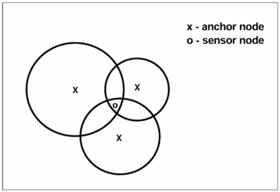 Node localization in a WSN deployed on a 2D plain ground is a straightforward task. One example is a location-unknown node that can estimate its distance to three nonlinear anchor nodes by measuring the RSS or time or angle of arrival of signals from these anchor nodes. Then, the location of the node can be estimated as the centroid of the intersection area of three circles drawn by keeping the anchor node as the center and the distance as the radius. This is illustrated in Figure 2.