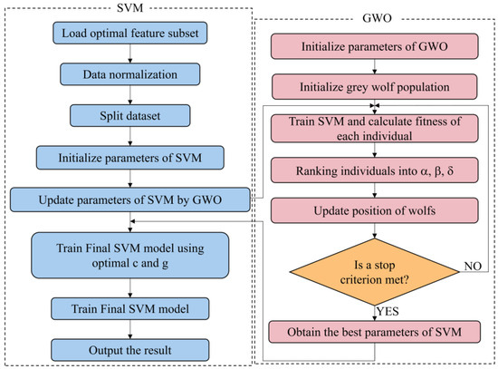 When the SVM model is optimized by GWO, the penalty factor C and kernel function parameter are mapped into position parameters of grey wolf individuals to generate α, β, and δ wolves, further updating the position of omega wolves. Next, continuous iterative optimization is performed until convergence conditions are met. Then the position of the α wolf is the output as the optimal solution for penalty factor and kernel function parameters. The SVM classification model is rebuilt using this optimal solution to obtain prediction results. As shown in Figure 4, implementation of the GWO-SVM model proceeds as follows: