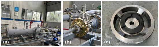 Experimental platform for pressure regulator: (a) experimental platform; (b) pressure regulator; and (c) cutting valve gasket to achieve internal leakage.