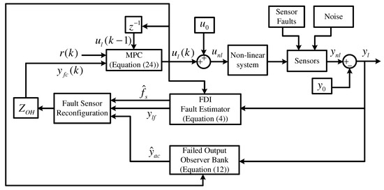The present section addresses the proposed FTC design. In particular, this section presents the MPC controller, the sensor fault reconstruction unit, the fault estimator, and the observer for fault reconstruction designs. For this purpose, consider a linear representation of the non-linear system with a general description: