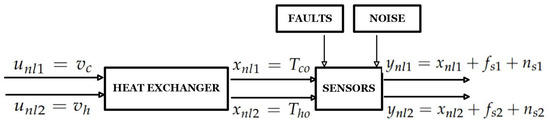 where and represent the outlet temperatures on the cold and hot side, respectively, considering that . In the model (25), and represent the system inputs, which are considered as the cold and hot side flow rates, respectively. In turn, and define the non-linear system state and input vectors, respectively. Finally, the system outputs are and measured with noise, with the corresponding fault occurrence, defining the system outputs with sensor faults and noise as follows: