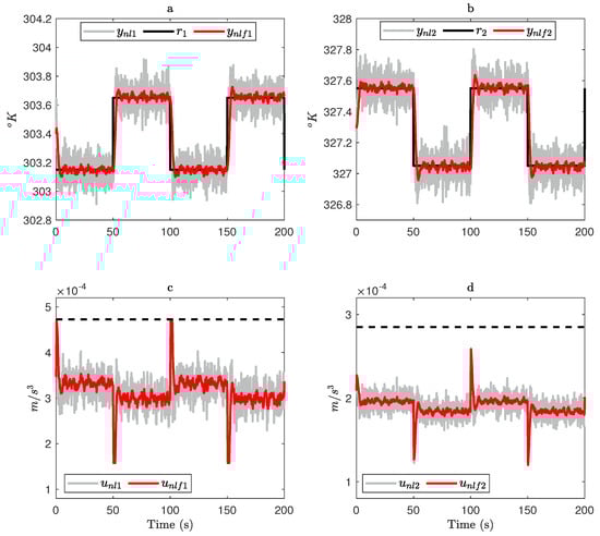 In this case, the results will demonstrate the effect of the filter integrated into the fault estimator and its benefits when filtered measurements are used to compute the control signal, rather than unfiltered measurements. From initial conditions and in the non-linear system, with a measurement noise and a fourth-order Runge–Kutta integration method, Figure 3 shows the simulation results for this case. This test is aimed at showing the MPC control performance by taking into account , referring to the desired values for and , respectively. We define the following reference values: