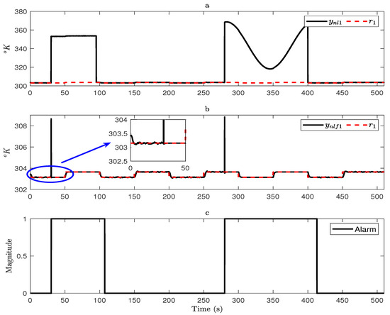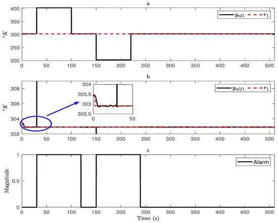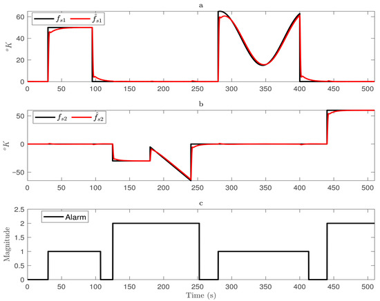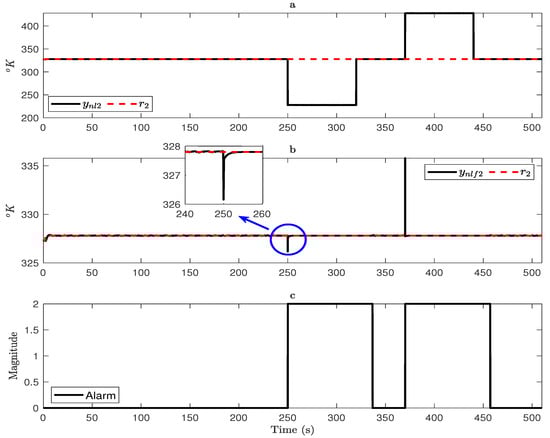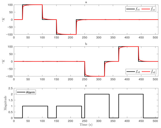 Figure 4a,b show the fault estimations and correctly reaching the fault values of and , respectively. Depending on the faulty output, the corresponding fault alarm indicator is activated (see Figure 4c). Notice that in the case of a fault in , the alarm indicator is set to 1, while in the case of a faulty condition in , the corresponding value is set to 2. Recall that this indicator is activated when the fault exceeds the defined threshold . It is worth mentioning that the threshold must be defined so that the fault estimations, which remain noisy, do not cause false fault alarms, resulting in an unnecessary fault reconfiguration process. It is important to note that the faults occur in terms of temperature to accurately show a sensor’s faulty condition. A positive value in a defined fault is interpreted as a measurement beyond the real value (BIAS), while the loss of effectiveness involves a measurement below the real value. This is an essential issue to consider while analyzing the results presented throughout this paper. As a concluding comment, the results in Figure 4 prove that the fault estimator and the fault alarm indicator perform their tasks correctly, allowing the fault reconfiguration process in the FTC. In turn, Figure 5 and Figure 6 present the simulation results for the system outputs.