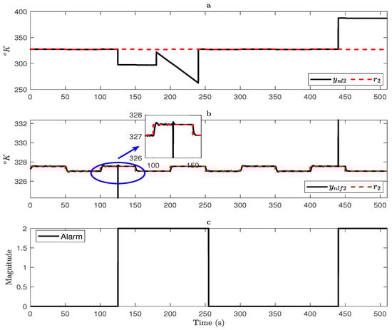 As for the system outputs, in turn, Figure 9 and Figure 10 present their corresponding results. Recalling that in this test the faults are considered in a steady-state condition for the system with constant references, Figure 9a shows the output . Its magnitude follows the applied fault, increasing or decreasing its value according to the faulty condition defined in Equation (36). In turn, Figure 9b depicts the FTC operation, giving rise to the reconfigured output . From the zoom presented in the figure, the control objective achievement can be seen due to the condition s. The FTC works properly despite the fault magnitude. The alarm generated in this case is depicted in Figure 9c, changing its value depending on the faulty sensor. Finally, Figure 10 shows the result of addressing the remaining output. A similar interpretation must be considered for analyzing Figure 10. The faulty output , the corresponding reconstruction , and the alarm can be seen in Figure 10a, Figure 10b and Figure 10c, respectively.