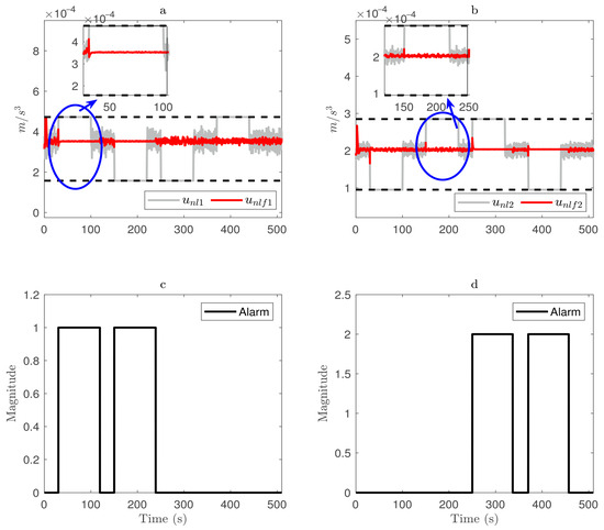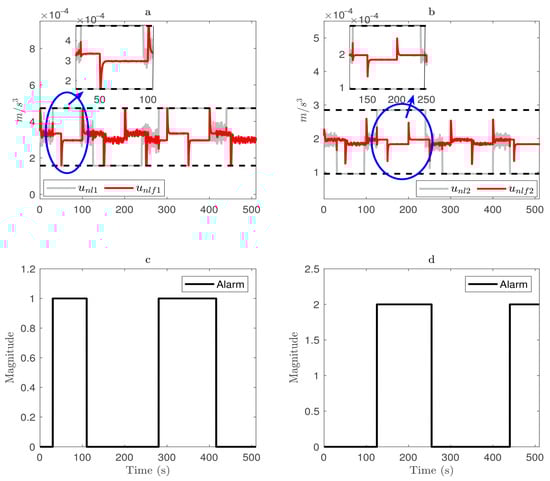 Finally, Figure 7 depicts the control signals in the faulty case. In Figure 7, the light grey graphs represent the system output when fault reconfiguration is not performed, while the rest of the graphs refer to the operation of the proposed FTC system. Figure 7a presents the results for fault occurrence in , focusing specifically on 30 s s and 280 s s. Notice that the control law generated when fault reconfiguration is not performed shows saturation in its magnitude due to the constraints set in the MPC design. Otherwise, if fault reconfiguration is performed, the control signal evolves as in the fault-free case with a transient during the reconfiguration process. Figure 7b shows the corresponding result for the fault occurrence in . The control signal, , provides the correct tracking reference despite the occurrence of the fault due to the fault reconfiguration process. However, if the fault reconfiguration process is not performed, the control input also presents saturation due to the constraints set in the MPC controller design. Finally, the corresponding alarms are presented in Figure 7c,d.