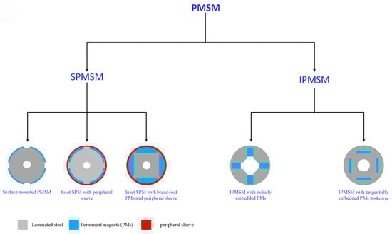 PMSMs could be classified into two types, namely, interior permanent magnets (IPMSM)s and surface permanent magnets (SPMSMs). Both IPMSMs and SPMSMs could take different designs according to the position of permanent magnets in the rotor, as shown in Figure 2. Table 1 presents a comparison between IPMSMs and SPMSMs [1,2,6,7,17,18,19,20,21,22,23,24,25,26,27,28].