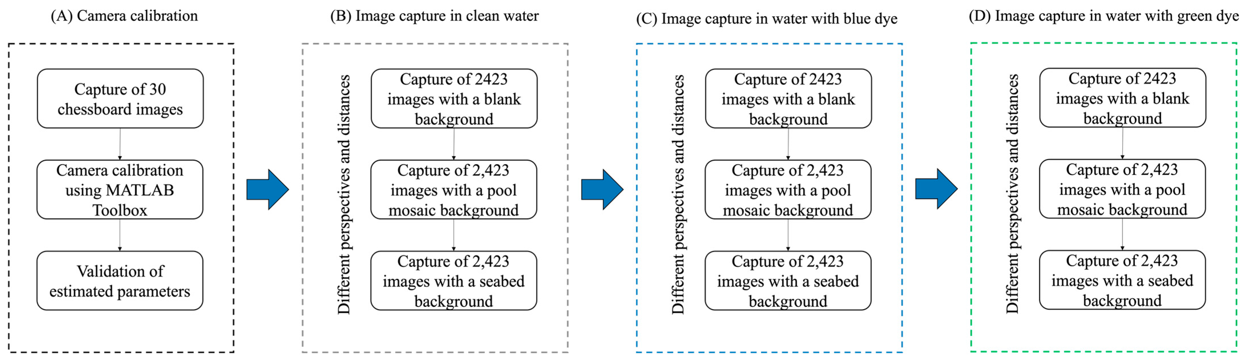 - Sánchez-Saquín, C.H.; Barriga-Rodríguez, L.; Baldenegro-Pérez, L.A.; Ronquillo-Lomeli, G.; Rodríguez-Olivares, N.A. Novel Neural Networks for Camera Calibration in Underwater Environments. IEEE Access 2024, 12, 181767–181786. [Google Scholar] [CrossRef]