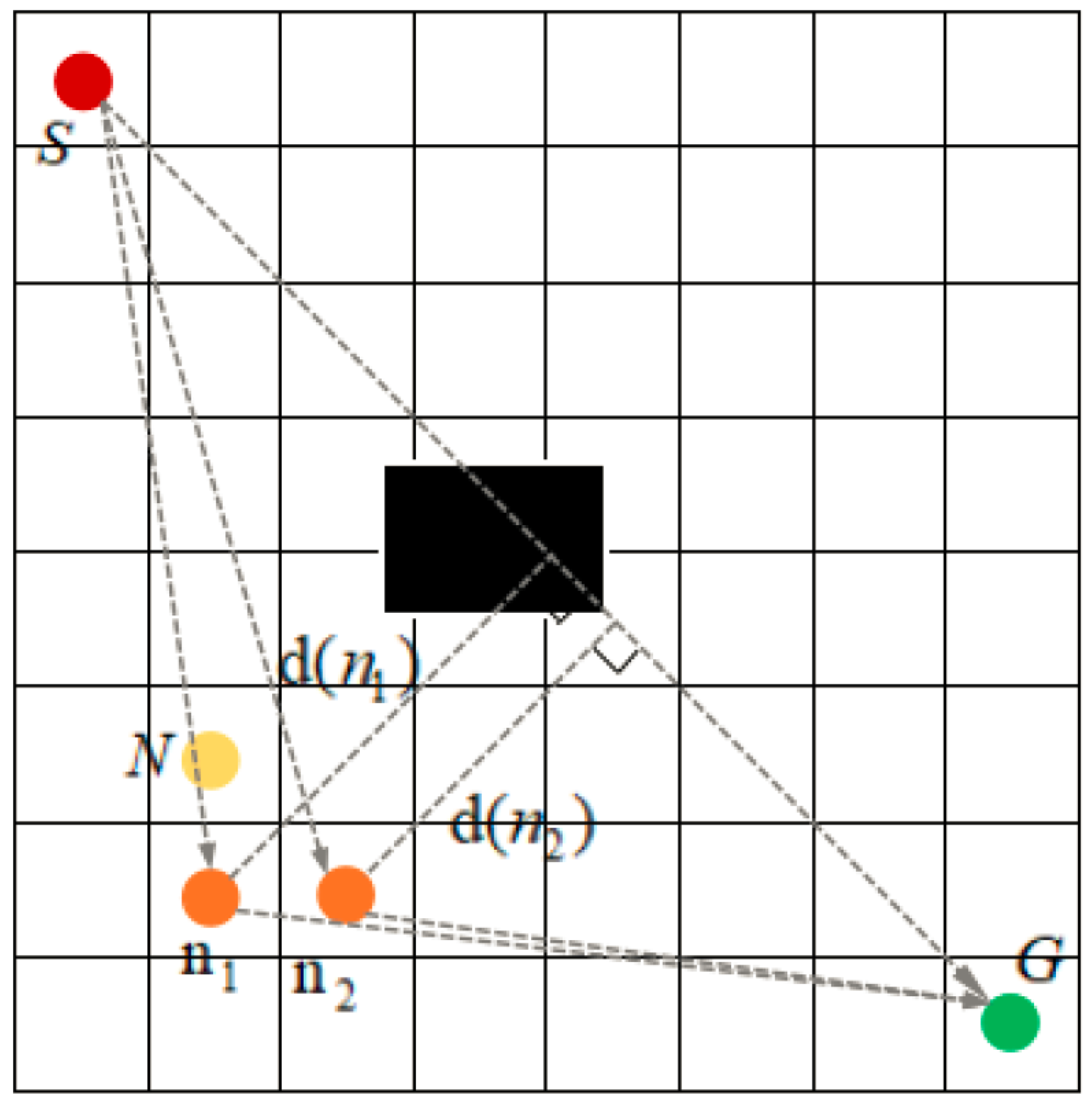 In contrast, XiangRong et al. [30] explicitly modify the evaluation function by appending a spatial constraint term C(n) to guide the search trajectory. Their cost function is f(n) = g(n) + h(n) + C(n). The function C(n) quantifies the perpendicular distance between the current node n and a straight line—termed the “guide line”—connecting the start and goal positions. Mathematically, for a node n = (xn,yn), start s = (xs,ys), and goal g = (xg,yg), the constraint is calculated as: