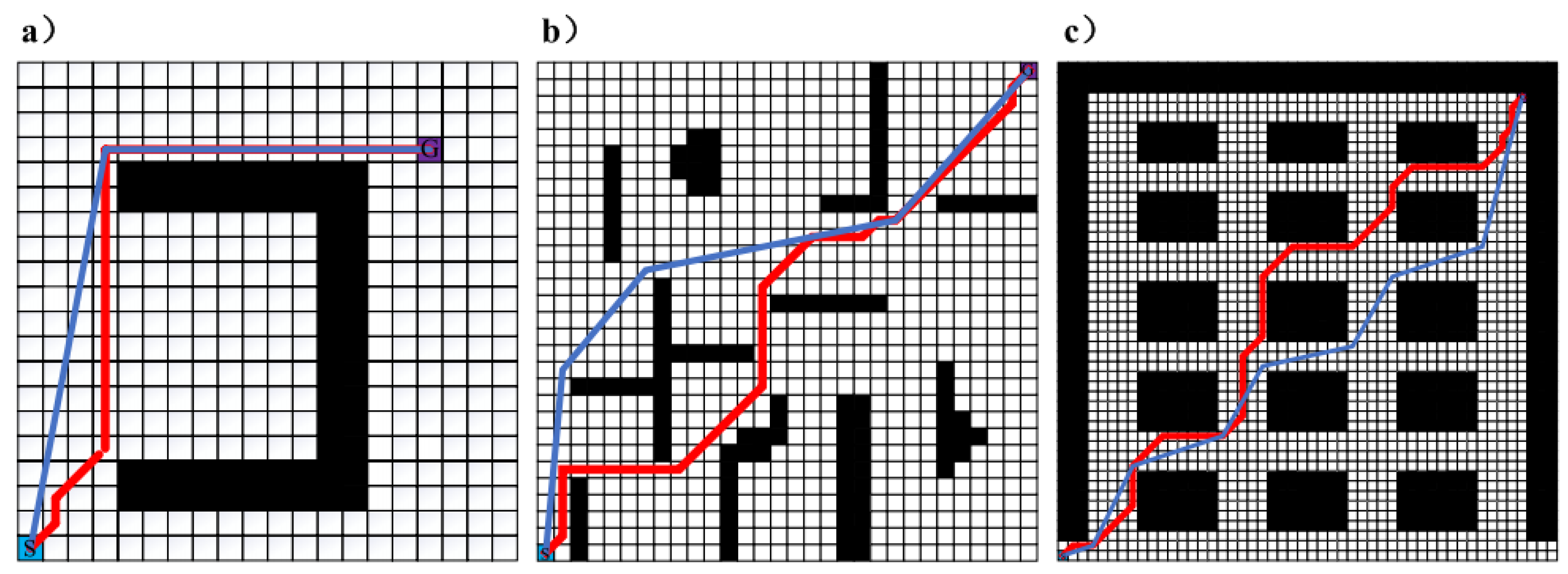 Figure 7. Comparison of the paths generated: (a) Map 1, (b) Map 2, (c) Map 3 [43].