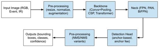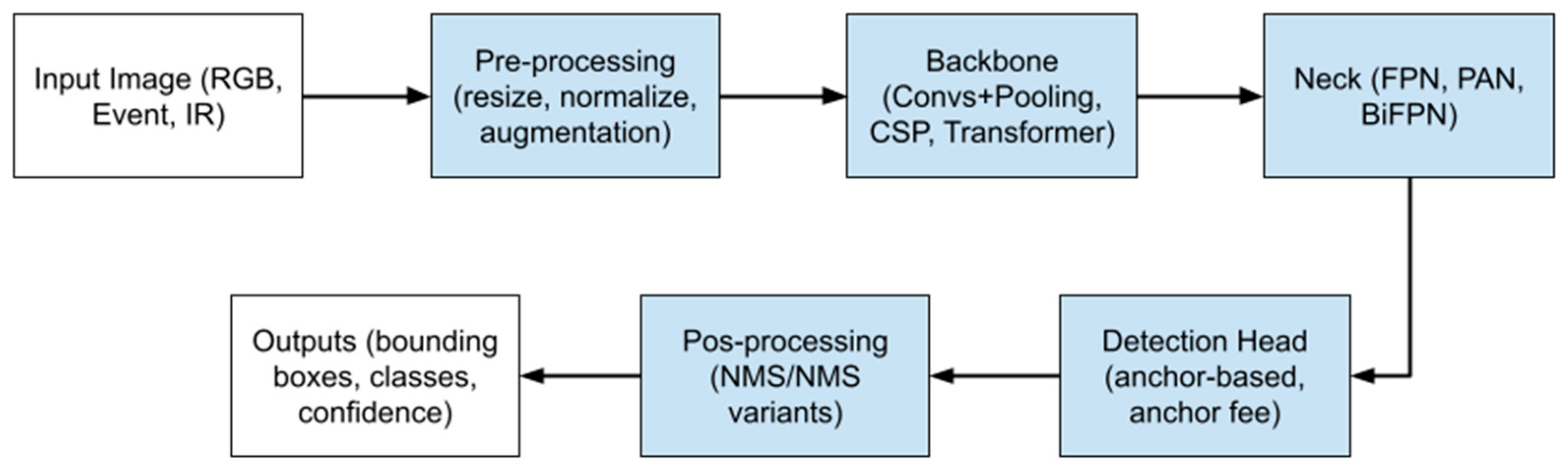 The YOLO pipeline begins with an input image (could be RGB (Red-Green-Blue) images, event-based vision, or Infra-Red (IR) images), which is preprocessed through resizing, normalization, or augmentation to match the network requirements. The image then passes through the backbone, typically a CNN architecture (e.g., Darknet, Cross Stage Partial (CSP) networks, or Transformer-based modules), which extracts hierarchical feature maps. These features are further refined in the neck, using architectures such as the Feature Pyramid Network (FPN), Path Aggregation Network (PAN), or Bidirectional Feature Pyramid Network (BiFPN) to enhance multi-scale feature representation. The detection head then predicts bounding boxes, object classes, and confidence scores, employing either anchor-based or anchor-free mechanisms depending on the YOLO variant. Finally, post-processing steps such as Non-Maximum Suppression (NMS) or its variants are applied to remove redundant detections, resulting in the final outputs of bounding boxes, class labels, and confidence scores. The algorithm performance is typically measured using metrics such as mean Average Precision (mAP), inference speed in frames per second (FPS), latency, and computational complexity in terms of parameters and floating-point operations per second (FLOPs) [].