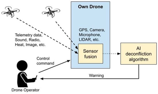 Among these challenges, one of the most pressing is deconfliction, which is the process of preventing collisions [,]. Drones must navigate not only around fixed obstacles, such as buildings, power lines, and towers, but also respond to dynamic hazards, including birds, adverse weather, and other airborne vehicles.