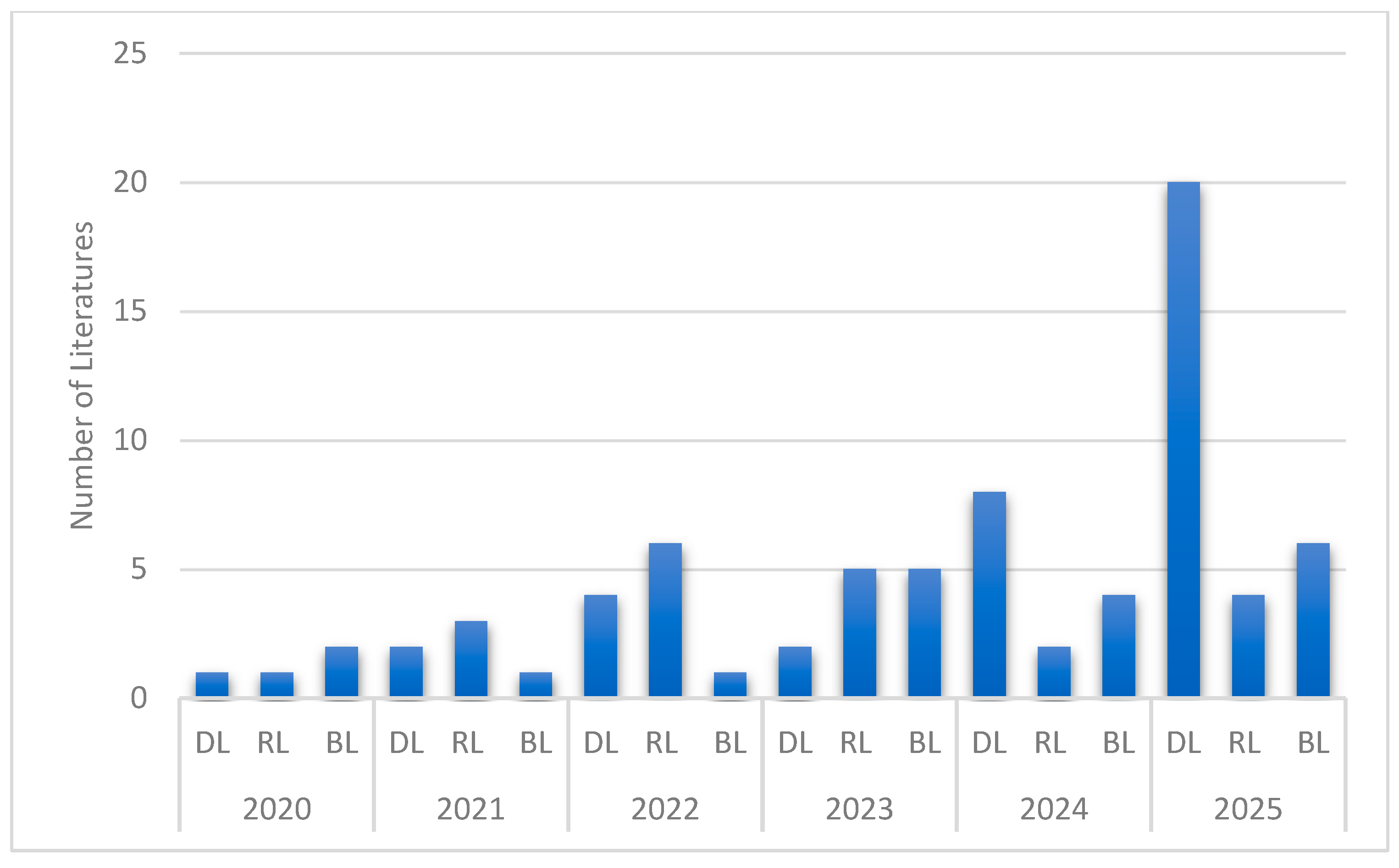 The results of the AI algorithm categories and the number of publications per year are shown in Figure 2. In total, deep learning (DL) has 37 publications, reinforcement learning (RL) has 21, and bio-inspired learning (BL) has 19.
