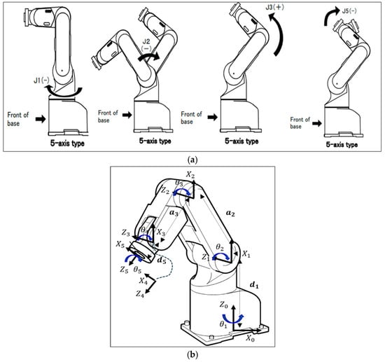 5-DOF Mitsubishi RV-2AJ robotic arm: (a) CAD model showing joint locations; (b) Kinematic parameters.
