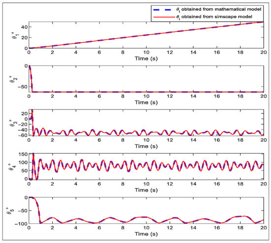 Comparison of joint angles (θ1–θ5) between the mathematical model and the Simscape model of the 5-DOF Mitsubishi RV-2AJ robot.