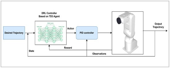 The DDPG algorithm constitutes an actor-critic DRL framework tailored for continuous action spaces, rendering it particularly well-suited for robotic control applications. DDPG employs a deterministic policy (actor) to generate continuous control actions and a value function approximator (critic) to assess action quality. Training stability is augmented through experience replay buffers and soft target network updates. TD3 extends DDPG by mitigating value overestimation bias and enhancing learning robustness via three methodological refinements: (i) clipped double Q-learning, (ii) delayed policy updates, and (iii) target policy smoothing. These innovations confer improved performance in high-dimensional continuous control tasks under stochastic dynamics. While DDPG and TD3 provide the foundational framework for this study, their theoretical and mathematical formulations are comprehensively detailed in References [11,12]. This work instead proposes a novel extension of TD3 through hybrid PID integration to optimize trajectory tracking performance.