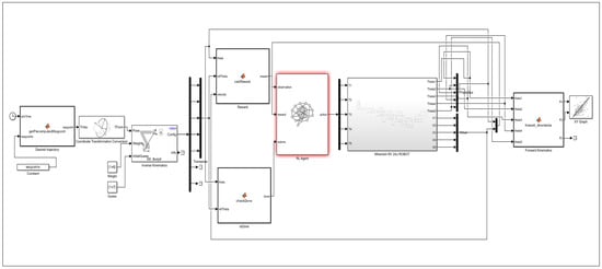 In this work, the trajectory tracking control of the 5-DOF Mitsubishi RV-2AJ robotic arm is addressed using a hybrid PID + TD3 controller, which is compared against three state-of-the-art DRL algorithms: DDPG, LC-DDPG, and TD3. The overall architecture and interaction flow of the DRL agents are illustrated in Figure 5. These model-free agents interact with the robotic system by receiving continuous observations such as joint positions, angular velocities, and target trajectory points, and outputting continuous torque commands for each joint. All compared DRL methods employ an actor–critic framework operating within the same observation and action spaces, but differ in stability and exploration mechanisms. DDPG serves as the baseline, enabling efficient policy learning in high-dimensional continuous action spaces. LC-DDPG enhances stability by incorporating Lyapunov-based constraints to guarantee safe policy updates. TD3 improves over DDPG by integrating twin critics, delayed policy updates, and target policy smoothing to reduce overestimation bias and improve training robustness. The proposed hybrid PID + TD3 controller combines the adaptive learning capability of TD3 with the fast error-correcting nature of PID control. The PID component ensures quick response, disturbance rejection, and reduced steady-state error, while the TD3 agent continuously adapts the control policy to optimize long-term tracking performance. This synergy allows the hybrid controller not only to achieve precise trajectory tracking but also to effectively eliminate external disturbances and uncertainties, a critical requirement for real robotic environments. During training, the TD3 agent optimizes its control policy based on a cumulative reward function that balances trajectory tracking accuracy, control smoothness, and energy efficiency. The PID loop provides an additional stabilizing action that compensates for sudden disturbances and nonlinearities, ensuring consistent tracking performance even under challenging operating conditions. By integrating model-free reinforcement learning with classical control, the proposed hybrid PID + TD3 controller demonstrates superior adaptability, robustness, and disturbance elimination capability, making it more reliable than both conventional DRL-only and traditional PID-based methods. The training of the proposed hybrid PID + TD3 controller is carried out in a high-fidelity simulation environment developed using MATLAB/Simulink’s Simscape Multibody toolbox, which accurately captures the kinematics and dynamics of the 5-DOF Mitsubishi RV-2AJ robotic arm. Within this environment, the controller interacts with the robotic system in real time, learning to refine torque commands and improve trajectory tracking accuracy through trial and error feedback. The hybrid structure combines the robustness of a PID controller with the adaptability of a TD3-based reinforcement learning agent, which accelerates convergence and enhances stability under varying conditions. Key hyperparameters such as neural network dimensions, training episodes, and state action representations directly influence the controller’s learning efficiency and precision. A major advantage of this hybrid approach is its strong ability to suppress disturbances and uncertainties during operation, ensuring smooth trajectory tracking and consistent torque regulation. The detailed training and simulation settings for the hybrid PID + TD3 controller are listed in Table 3, while Figure 6 presents the overall simulink-based training architecture.
