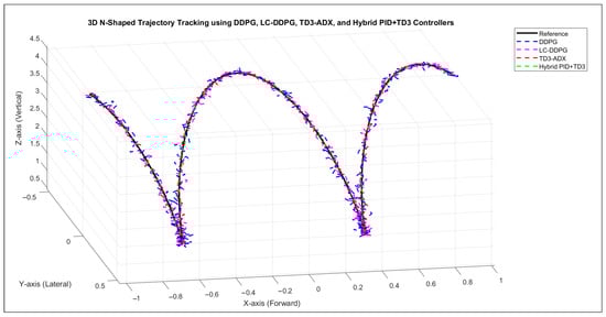 Three-dimensional N-shaped trajectory tracking performance using DDPG, LC-DDPG, TD3-ADX, and TD3 + PID controllers.